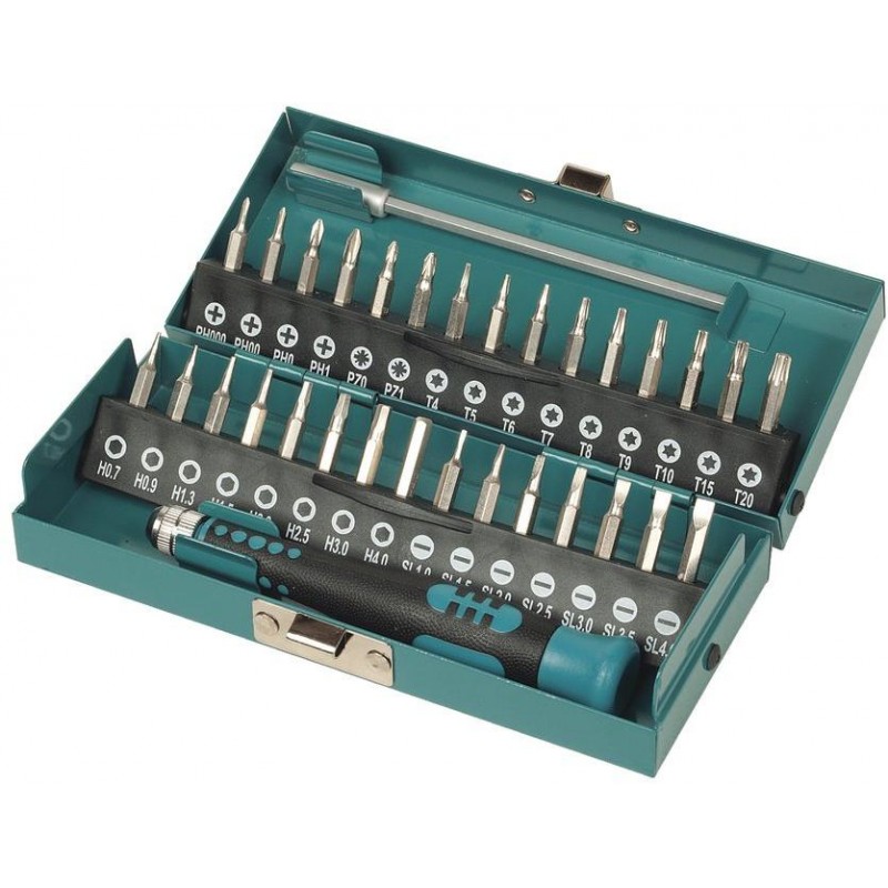 30 bitů pro jemnou mechaniku v různých velikostech pro šrouby s plochou a křížovou drážkou, hlavou TORX a s vnitřním šestihranem 28 mm, vč. ručního šroubováku a prodloužení.